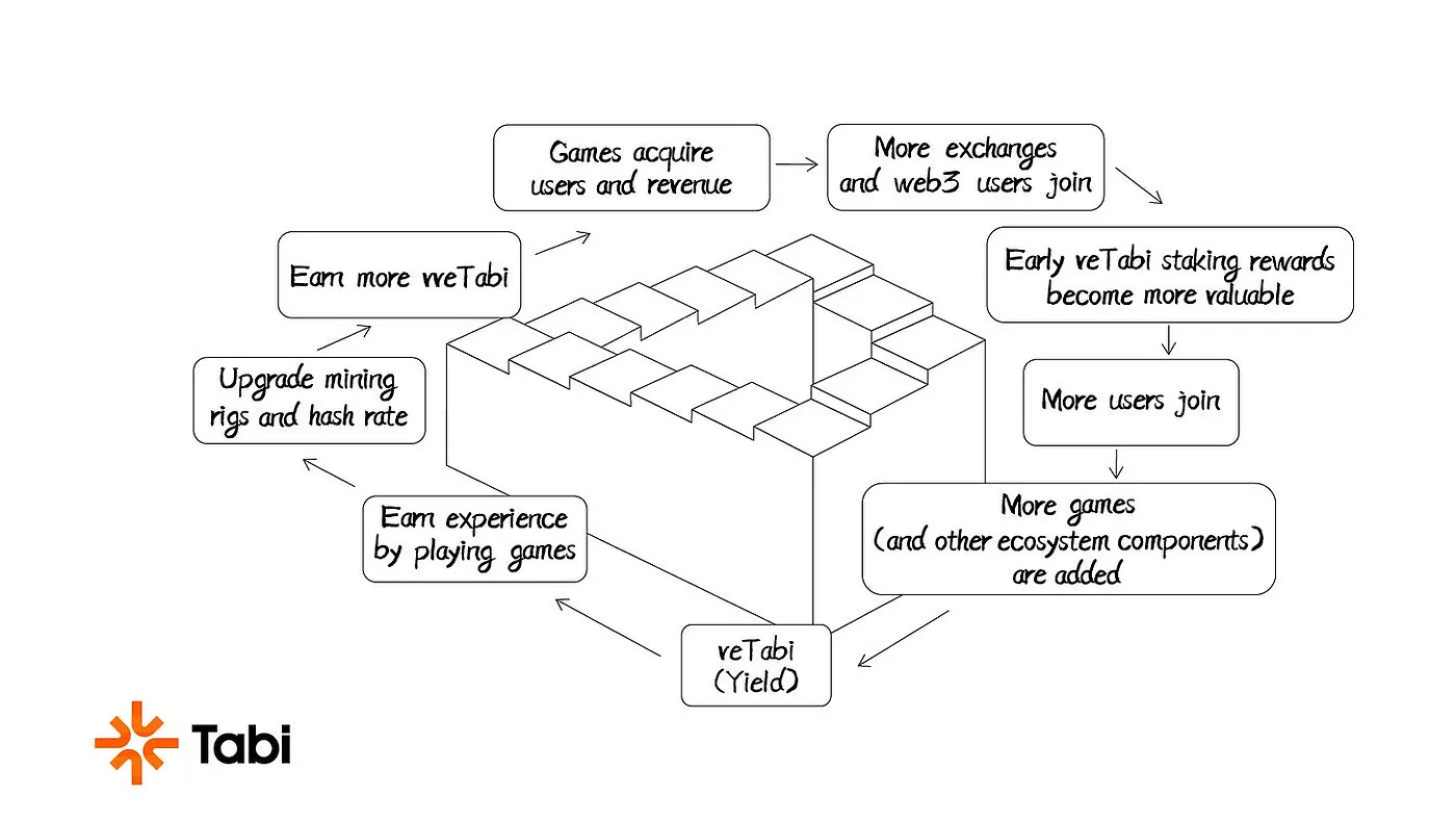 Users earn veTabi by managing Tabi nodes, voting for rewards, and participating in ecosystem projects that increase their node levels (earning experience points) and the percentage of mining power. This integrates users into the ecosystem, uniting the chain and application levels.